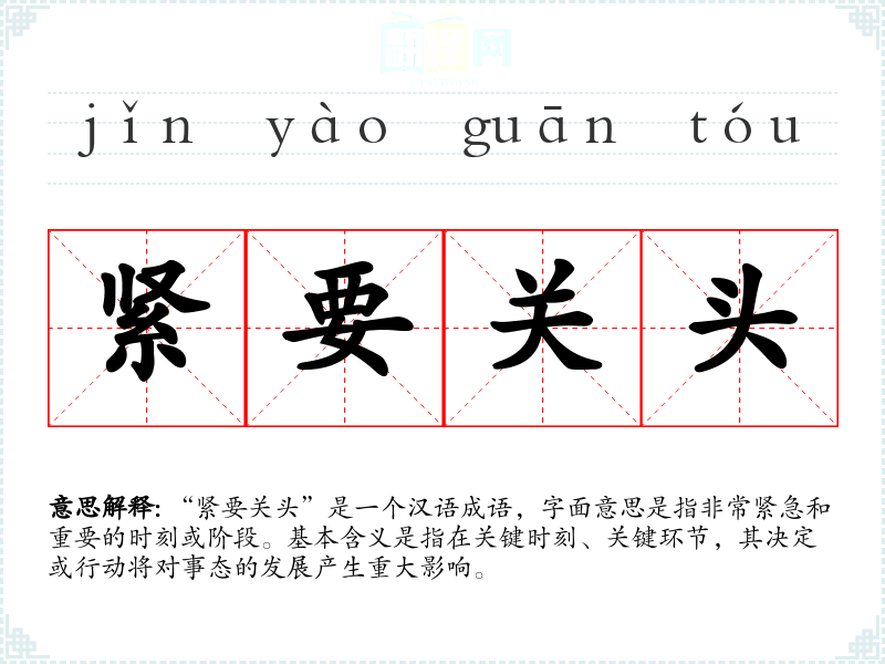 “紧要关头”是一个汉语成语,字面意思是指非常紧急和重要的时刻或阶段。基本含义是指在关键时刻、关键环节,其决定或行动将对事态的发展产生重大影响。
