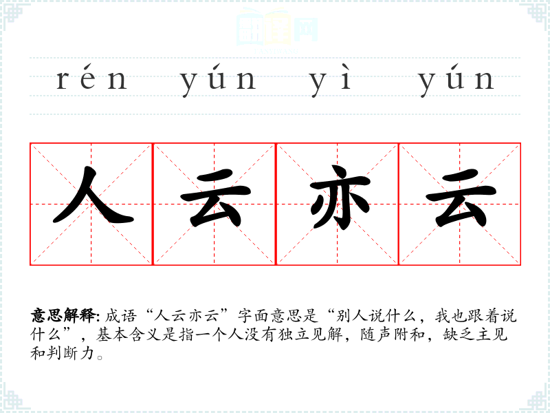 成语“人云亦云”字面意思是“别人说什么,我也跟着说什么”,基本含义是指一个人没有独立见解,随声附和,缺乏主见和判断力。