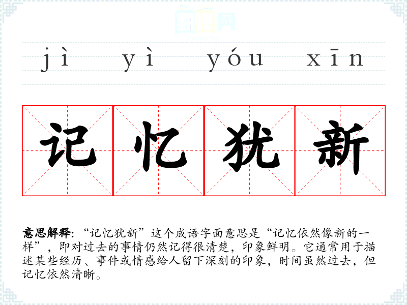 | 记忆犹新 | 犹:还。过去的事,至今印象还非常清楚,就象刚才发生的一样。 |