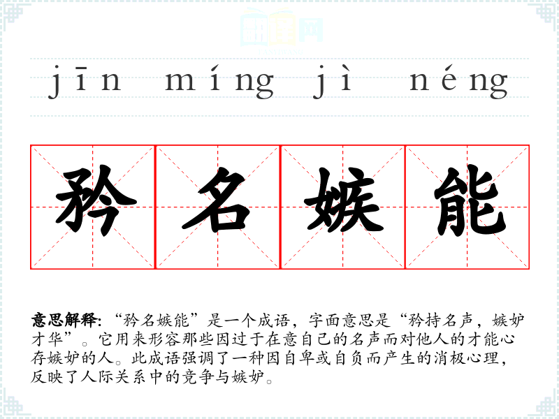 “矜名嫉能”是一个成语,字面意思是“矜持名声,嫉妒才华”。它用来形容那些因过于在意自己的名声而对他人的才能心存嫉妒的人。此成语强调了一种因自卑或自负而产生的消极心理,反映了人际关系中的竞争与嫉妒。
