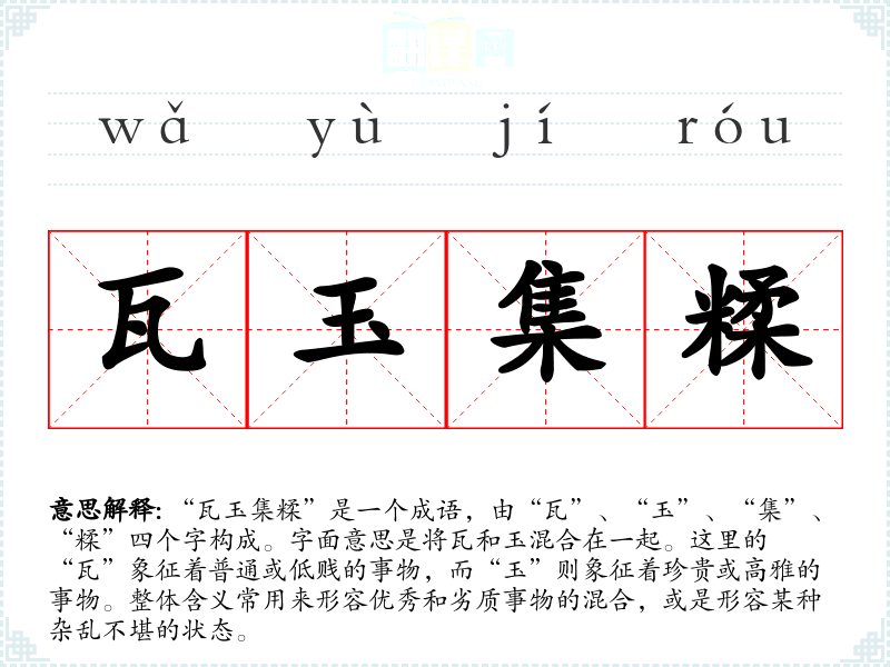 “瓦玉集糅”的具体历史背景和典故并不明确,但从字面理解来看,可以推测出它可能源于对人事物的对比与评判。在古代文化中,常常将珍贵的玉与普通的瓦对比,以表现出两者之间的差异。这种对比的思维方式在文学、哲学等多个领域都有体现。