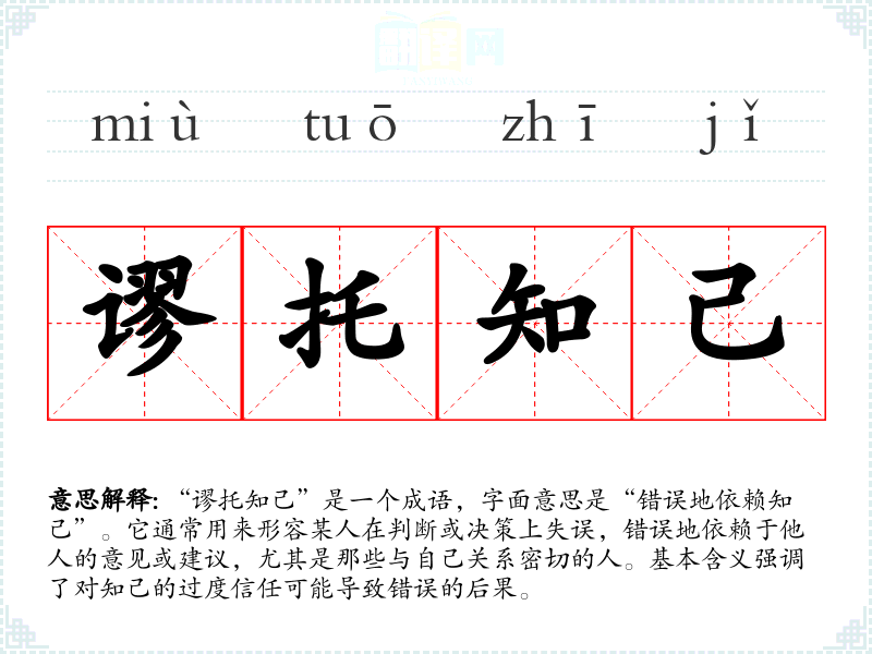 “谬托知己”是一个成语,字面意思是“错误地依赖知己”。它通常用来形容某人在判断或决策上失误,错误地依赖于他人的意见或建议,尤其是那些与自己关系密切的人。基本含义强调了对知己的过度信任可能导致错误的后果。