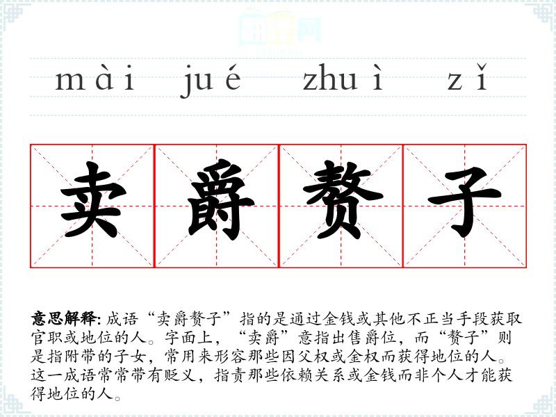 成语“卖爵赘子”指的是通过金钱或其他不正当手段获取官职或地位的人。字面上,“卖爵”意指出售爵位,而“赘子”则是指附带的子女,常用来形容那些因父权或金权而获得地位的人。这一成语常常带有贬义,指责那些依赖关系或金钱而非个人才能获得地位的人。