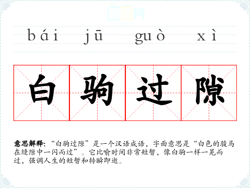 “白驹过隙”是一个汉语成语,字面意思是“白色的骏马在缝隙中一闪而过”。它比喻时间非常短暂,像白驹一样一晃而过,强调人生的短暂和转瞬即逝。