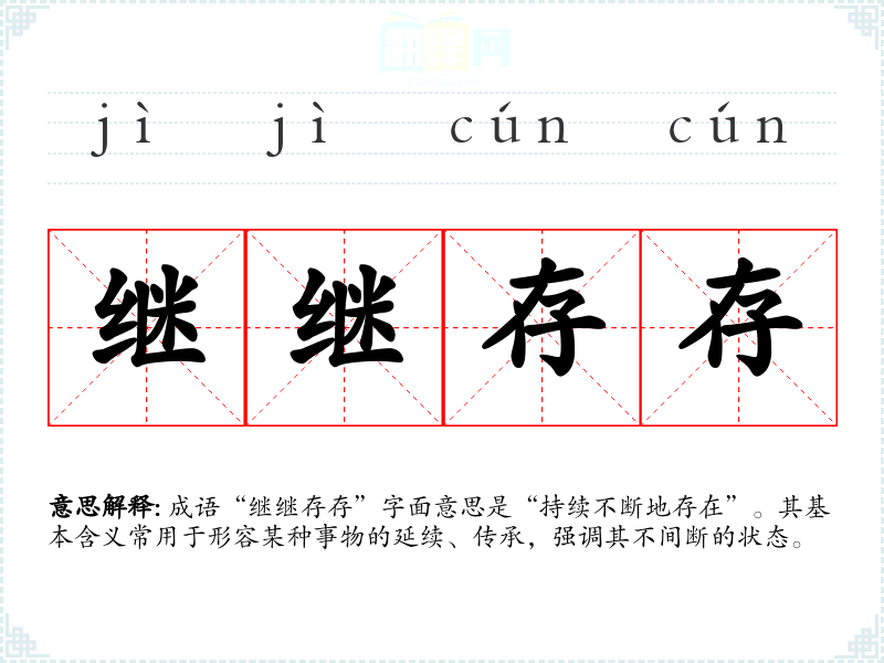 成语“继继存存”字面意思是“持续不断地存在”。其基本含义常用于形容某种事物的延续、传承,强调其不间断的状态。