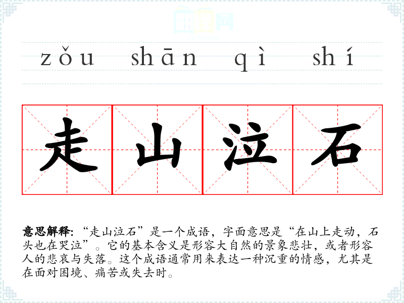 “走山泣石”是一个成语,字面意思是“在山上走动,石头也在哭泣”。它的基本含义是形容大自然的景象悲壮,或者形容人的悲哀与失落。这个成语通常用来表达一种沉重的情感,尤其是在面对困境、痛苦或失去时。