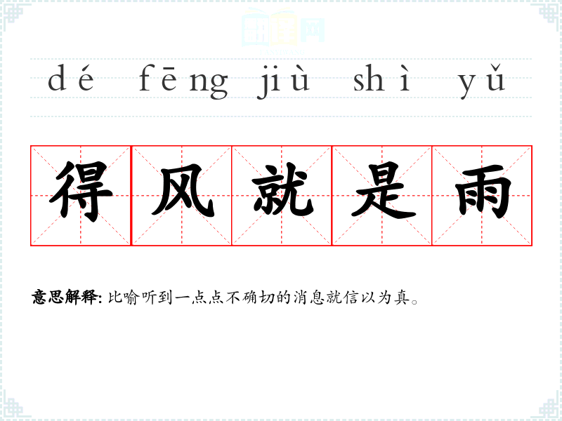 | 五日一风,十日一雨 | 指每天刮一次风,十天下一场雨。形容风调雨顺。旧时作为太平盛世的吉祥征兆。 |