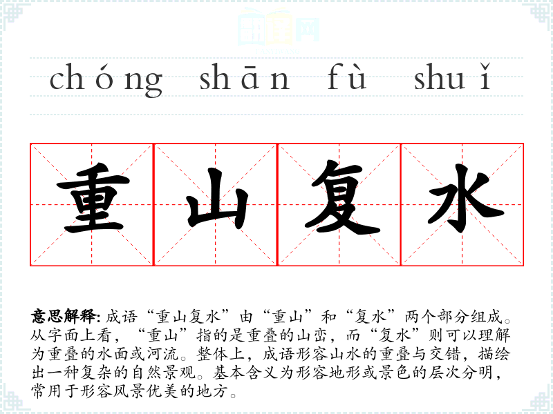 成语“重山复水”由“重山”和“复水”两个部分组成。从字面上看,“重山”指的是重叠的山峦,而“复水”则可以理解为重叠的水面或河流。整体上,成语形容山水的重叠与交错,描绘出一种复杂的自然景观。基本含义为形容地形或景色的层次分明,常用于形容风景优美的地方。
