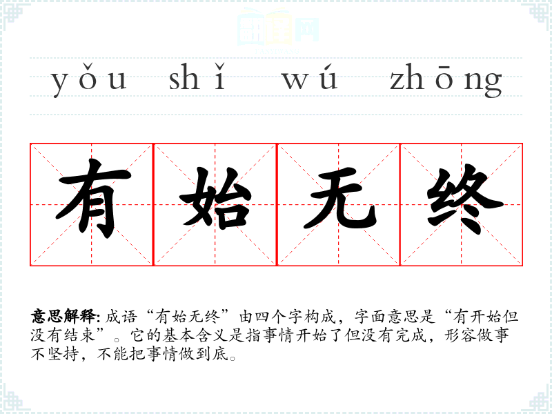 成语“有始无终”由四个字构成,字面意思是“有开始但没有结束”。它的基本含义是指事情开始了但没有完成,形容做事不坚持,不能把事情做到底。