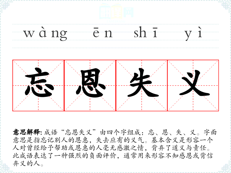 在**传统文化中,家族、朋友之间的恩义和忠诚被极为重视。“忘恩失义”不仅是对个人行为的谴责,也反映了社会对诚信、道义的重视。在现代社会,虽然人际关系更加复杂,但这一成语依然适用于描述那些背离传统道德的行为。