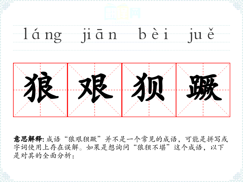 成语“狼艰狈蹶”并不是一个常见的成语,可能是拼写或字词使用上存在误解。如果是想询问“狼狈不堪”这个成语,以下是对其的全面分析: