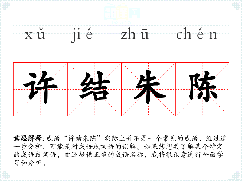 成语“许结朱陈”实际上并不是一个常见的成语,经过进一步分析,可能是对成语或词语的误解。如果您想要了解某个特定的成语或词语,欢迎提供正确的成语名称,我将很乐意进行全面学*和分析。
