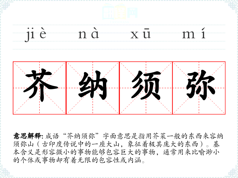 成语“芥纳须弥”字面意思是指用芥菜一般的东西来容纳须弥山(古印度传说中的一座大山,象征着极其庞大的东西)。基本含义是形容微小的事物能够包容巨大的事物,通常用来比喻渺小的个体或事物却有着无限的包容性或内涵。
