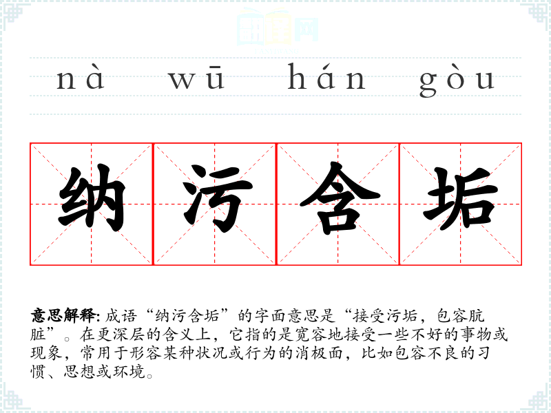 成语“纳污含垢”的字面意思是“接受污垢,包容肮脏”。在更深层的含义上,它指的是宽容地接受一些不好的事物或现象,常用于形容某种状况或行为的消极面,比如包容不良的习惯、思想或环境。