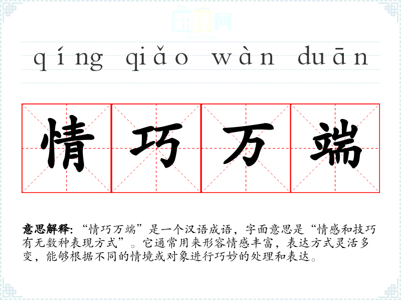 “情巧万端”是一个汉语成语,字面意思是“情感和技巧有无数种表现方式”。它通常用来形容情感丰富,表达方式灵活多变,能够根据不同的情境或对象进行巧妙的处理和表达。
