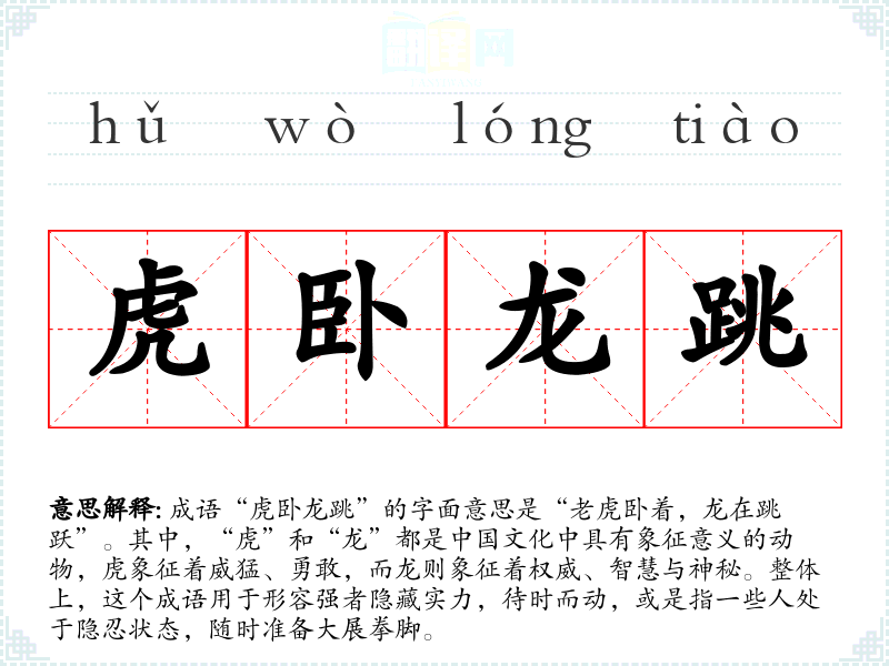 成语“虎卧龙跳”的字面意思是“卧着,龙在跳跃”。其中,“虎”和“龙”都是文化中具有象征意义的动物,虎象征着威猛、勇敢,而龙则象征着权威、智慧与神秘。整体上,这个成语用于形容强者隐藏实力,待时而动,或是指一些人处于隐忍状态,随时准备大展拳脚。