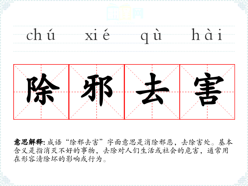 成语“除邪去害”字面意思是消除邪恶,去除害处。基本含义是指消灭不好的事物,去除对人们生活或社会的危害,通常用在形容清除坏的影响或行为。