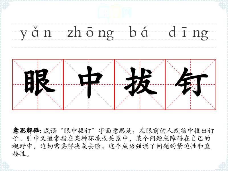 成语“眼中拔钉”字面意思是:在眼前的人或物中拔出钉子。引申义通常指在某种环境或关系中,某个问题或障碍在自己的视野中,迫切需要解决或去除。这个成语强调了问题的紧迫性和直接性。