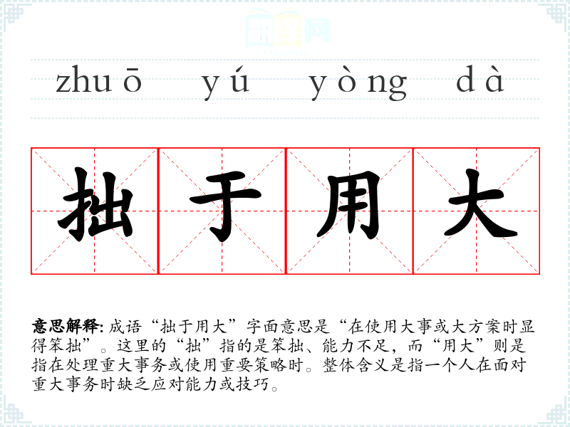 成语“拙于用大”字面意思是“在使用大事或大方案时显得笨拙”。这里的“拙”指的是笨拙、能力不足,而“用大”则是指在处理重大事务或使用重要策略时。整体含义是指一个人在面对重大事务时缺乏应对能力或技巧。