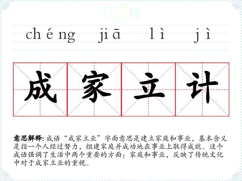 成语“成家立业”字面意思是建立家庭和事业,基本含义是指一个人经过努力,组建家庭并成功地在事业上取得成就。这个成语强调了生活中两个重要的方面:家庭和事业,反映了传统文化中对于成家立业的重视。