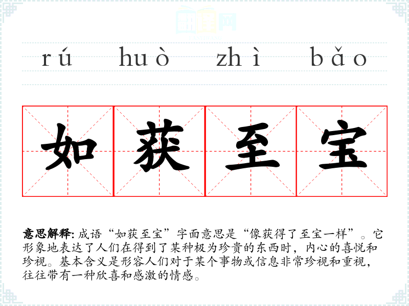 成语“如获至宝”字面意思是“像获得了至宝一样”。它形象地表达了人们在得到了某种极为珍贵的东西时,内心的喜悦和珍视。基本含义是形容人们对于某个事物或信息非常珍视和重视,往往带有一种欣喜和感激的情感。