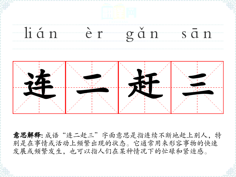 成语“连二赶三”字面意思是指连续不断地赶上别人,特别是在事情或活动上频繁出现的状态。它通常用来形容事物的快速发展或频繁发生,也可以指人们在某种情况下的忙碌和紧迫感。