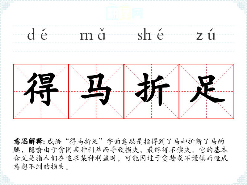 “得马折足”出自《后汉书·光武帝纪》。历史背景上,这个成语反映了古人对于利益与损失之间关系的深刻理解。在古代,马是重要的交通工具,能够带来便利与财富,然而如果过于贪心,最终反而会导致更大的损失。