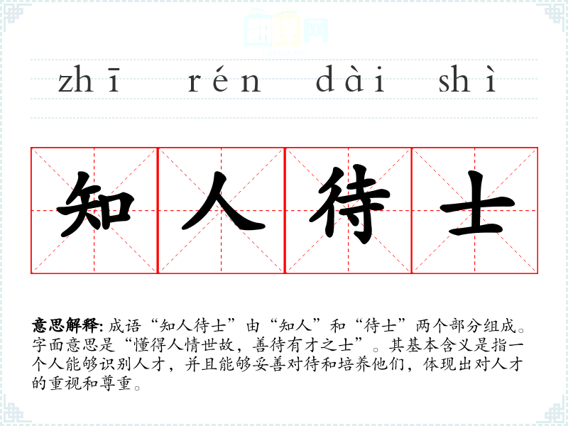 成语“知人待士”由“知人”和“待士”两个部分组成。字面意思是“懂得人情世故,善待有才之士”。其基本含义是指一个人能够识别人才,并且能够妥善对待和培养他们,体现出对人才的重视和尊重。
