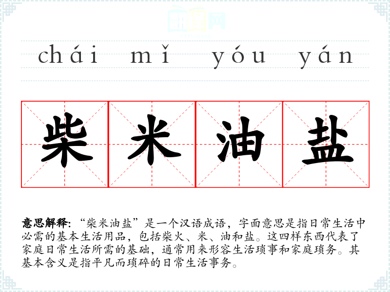 - 日常对话:在家庭讨论开支、生活琐事时,常会提到“柴米油盐”,强调家庭生活的平常。