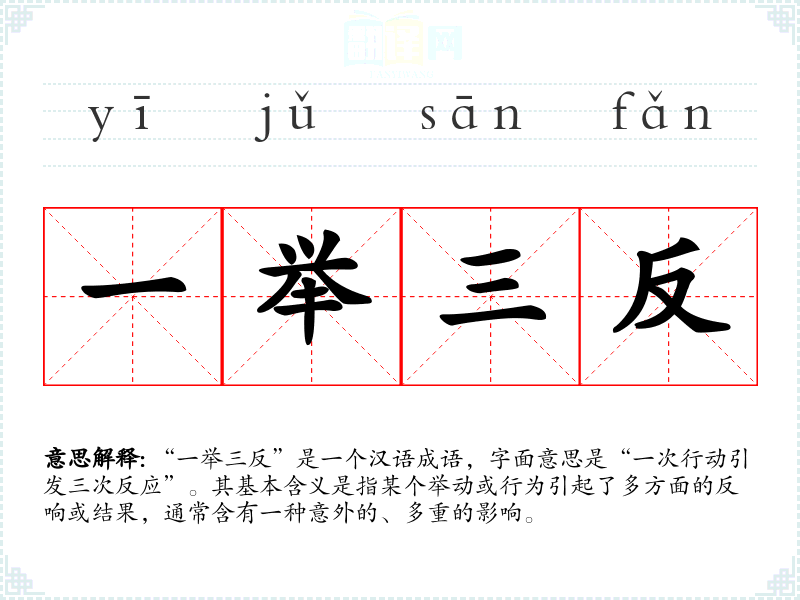 “一举三反”是一个汉语成语,字面意思是“一次行动引发三次反应”。其基本含义是指某个举动或行为引起了多方面的反响或结果,通常含有一种意外的、多重的影响。