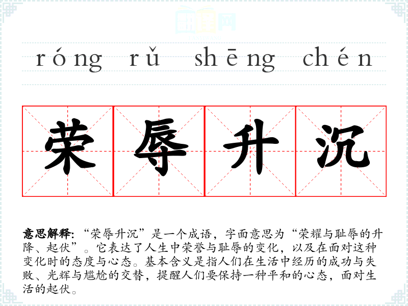 “荣辱升沉”是一个成语,字面意思为“荣耀与耻辱的升降、起伏”。它表达了人生中荣誉与耻辱的变化,以及在面对这种变化时的态度与心态。基本含义是指人们在生活中经历的成功与失败、光辉与尴尬的交替,提醒人们要保持一种平和的心态,面对生活的起伏。
