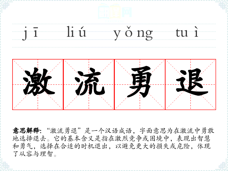 “激流勇退”是一个汉语成语,字面意思为在激流中勇敢地选择退去。它的基本含义是指在激烈竞争或困境中,表现出智慧和勇气,选择在合适的时机退出,以避免更大的损失或危险,体现了从容与理智。