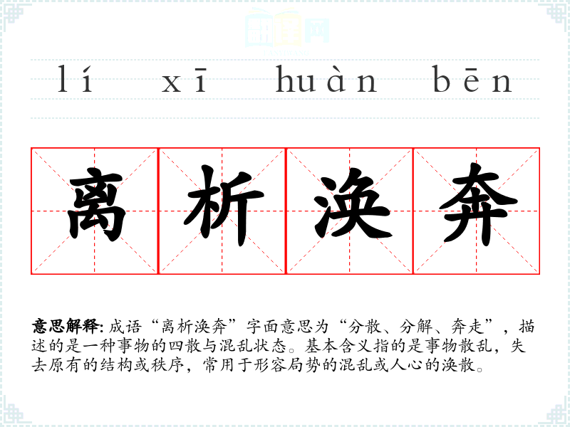 成语“离析涣奔”字面意思为“分散、分解、奔走”,描述的是一种事物的四散与混乱状态。基本含义指的是事物散乱,失去原有的结构或秩序,常用于形容局势的混乱或人心的涣散。
