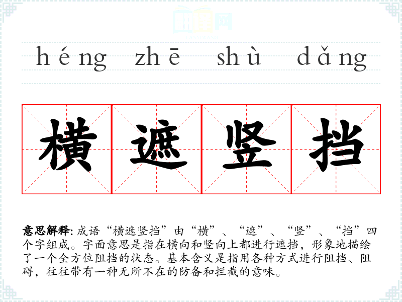 成语“横遮竖挡”由“横”、“遮”、“竖”、“挡”四个字组成。字面意思是指在横向和竖向上都进行遮挡,形象地描绘了一个全方位阻挡的状态。基本含义是指用各种方式进行阻挡、阻碍,往往带有一种无所不在的防备和拦截的意味。