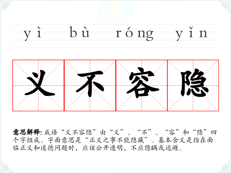 成语“义不容隐”由“义”、“不”、“容”和“隐”四个字组成。字面意思是“正义之事不能隐藏”。基本含义是指在面临正义和道德问题时,应该公开透明,不应隐瞒或逃避。
