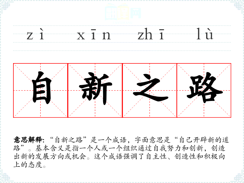 “自新之路”是一个成语,字面意思是“自己开辟新的道路”。基本含义是指一个人或一个组织通过自我努力和创新,创造出新的发展方向或机会。这个成语强调了自主性、创造性和积极向上的态度。