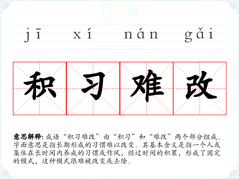 成语“积难改”由“积”和“难改”两个部分组成。字面意思是指长期形成的惯难以改变。其基本含义是指一个人或集体在长时间内养成的惯或作风,经过时间的积累,形成了固定的模式,这种模式很难被改变或去除。