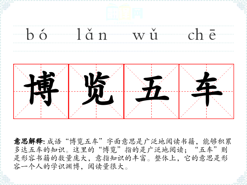 | 博览五车 | 指读书多,学识渊博。 |
