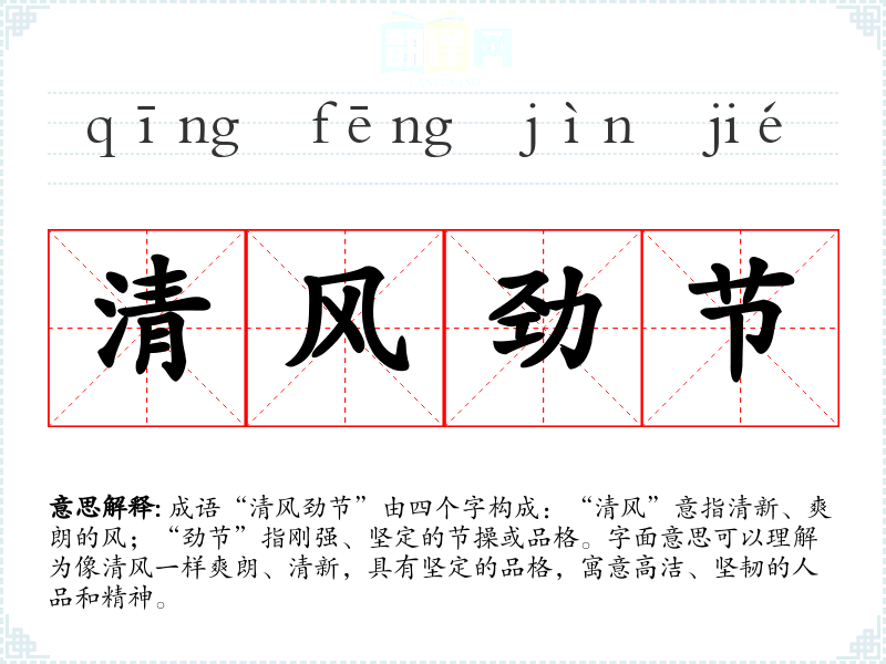 成语“清风劲节”由四个字构成:“清风”意指清新、爽朗的风;“劲节”指刚强、坚定的节操或品格。字面意思可以理解为像清风一样爽朗、清新,具有坚定的品格,寓意高洁、坚韧的人品和精神。