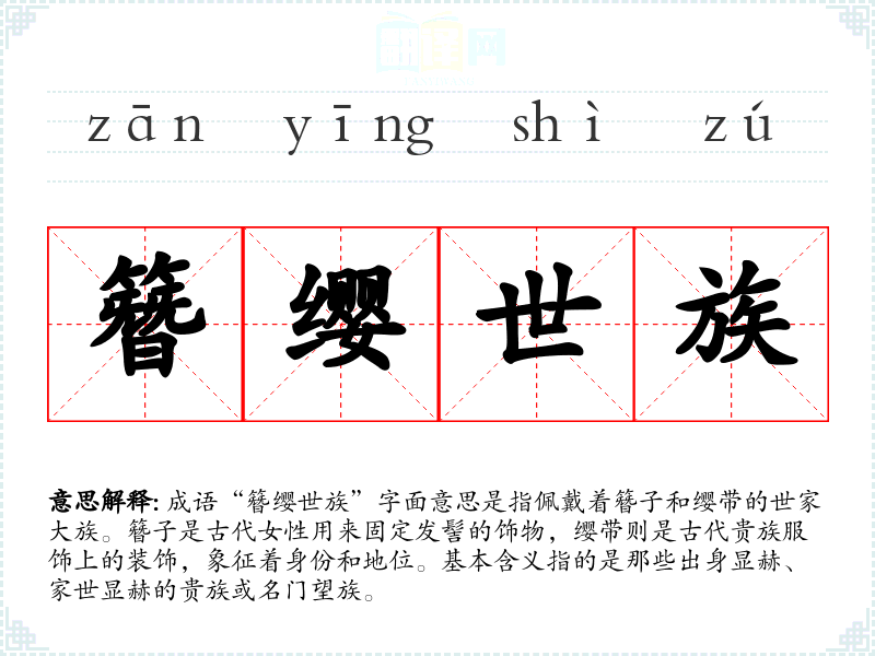 | 簪缨世族 | 簪和缨,古时达官贵人的冠饰,用来把冠固着在头上。旧时指世代作官的人家。 |