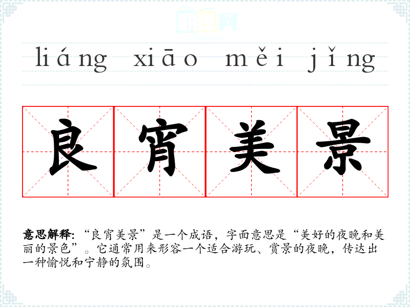 “良宵美景”是一个成语,字面意思是“美好的夜晚和美丽的景色”。它通常用来形容一个适合游玩、赏景的夜晚,传达出一种愉悦和宁静的氛围。