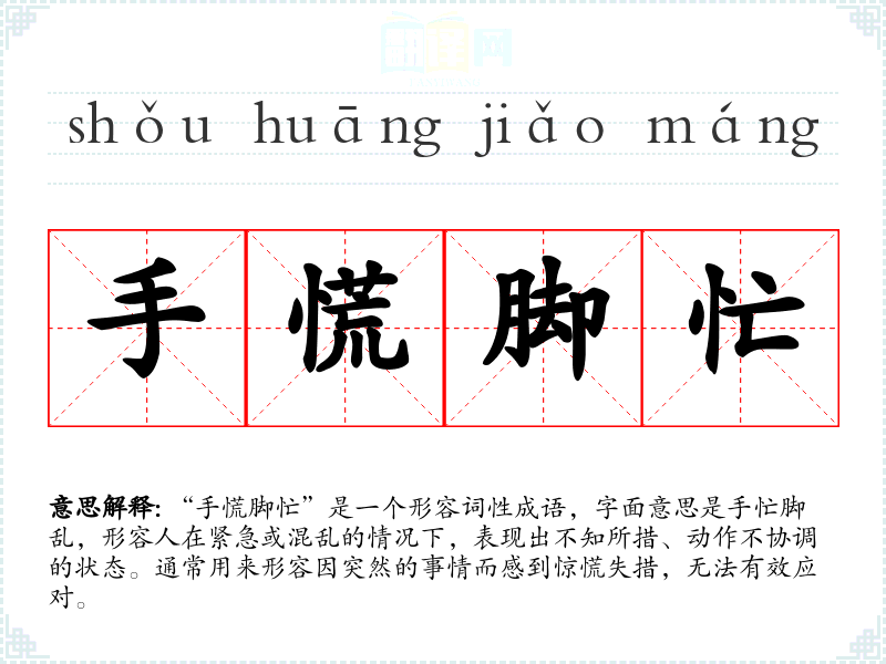 “手慌脚忙”是一个形容词性成语,字面意思是手忙脚乱,形容人在紧急或混乱的情况下,表现出不知所措、动作不协调的状态。通常用来形容因突然的事情而感到惊慌失措,无法有效应对。
