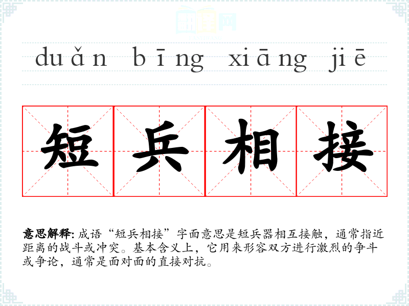 成语“短兵相接”字面意思是短兵器相互接触,通常指近距离的战斗或冲突。基本含义上,它用来形容双方进行激烈的争斗或争论,通常是面对面的直接对抗。