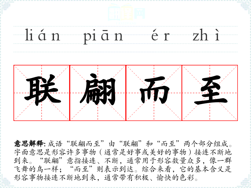 在**文化中,许多成语都蕴含着丰厚的历史和哲学意义。“联翩而至”不仅反映了对美好事物的期待,也体现了人们对生活中积极变化的向往。在现代社会,这个成语仍然适用,表达了人们对美好未来的期盼。