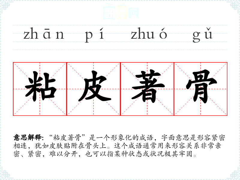 “粘皮著骨”是一个形象化的成语,字面意思是形容紧密相连,犹如皮肤贴附在骨头上。这个成语通常用来形容关系非常亲密、紧密,难以分开,也可以指某种状态或状况极其牢固。