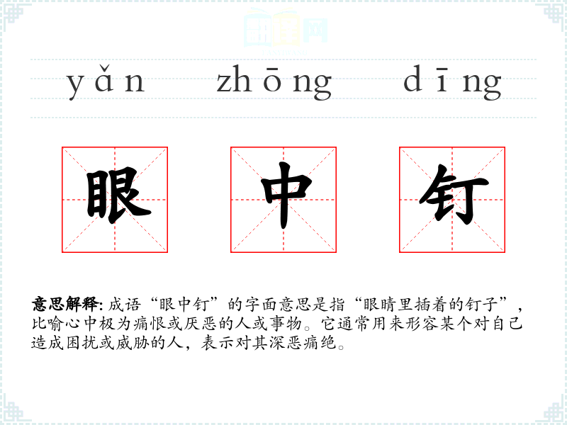 - 这些成语则表示内心平静、对事情的清楚理解,反映出与“眼中钉”截然不同的情感状态。