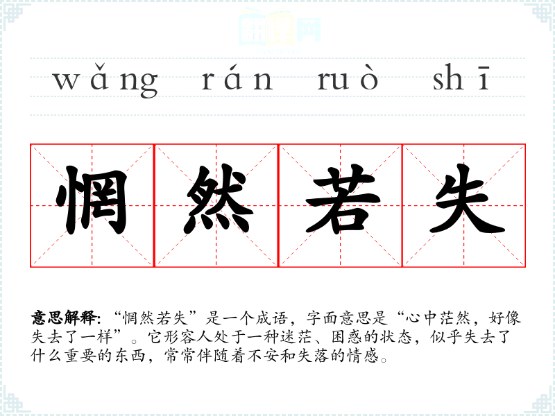 “惘然若失”是一个成语,字面意思是“心中茫然,好像失去了一样”。它形容人处于一种迷茫、困惑的状态,似乎失去了什么重要的东西,常常伴随着不安和失落的情感。
