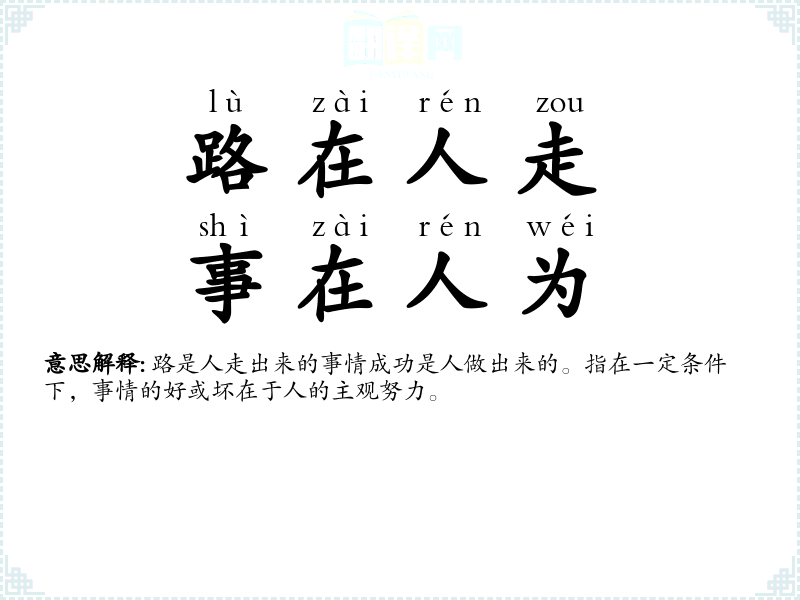 路是人走出来的事情成功是人做出来的。指在一定条件下,事情的好或坏在于人的主观努力。 |