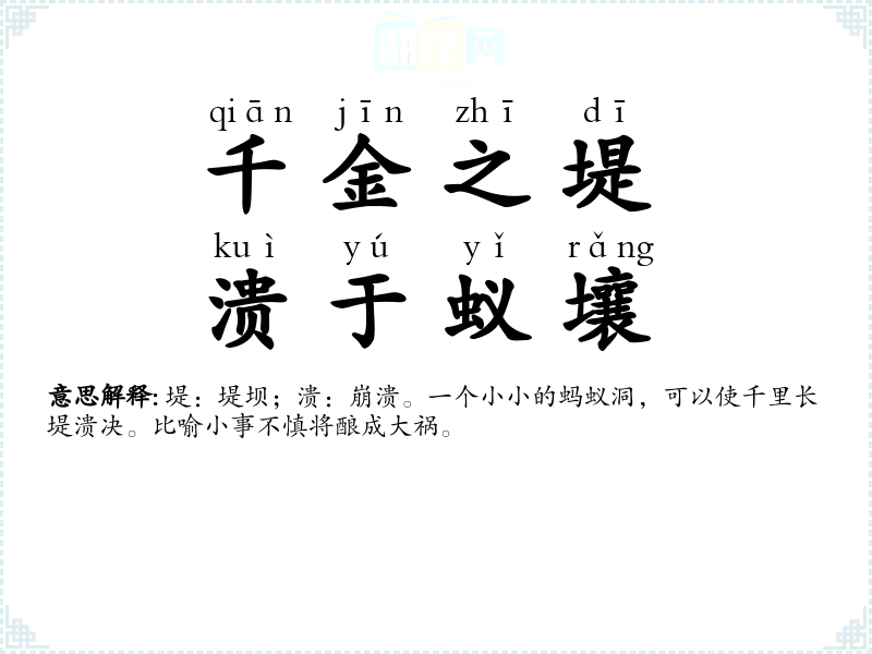 堤:堤坝;溃:崩溃;蚁穴:蚂蚁洞。一个小小的蚂蚁洞,可以使千里长堤溃决。比喻小事不慎将酿成大祸。 |