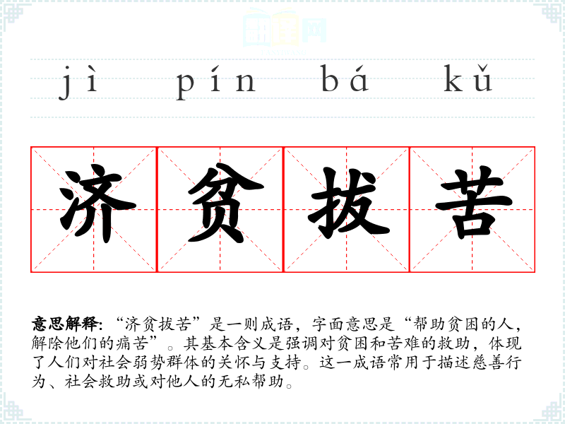 “济贫拔苦”是一则成语,字面意思是“帮助贫困的人,解除他们的痛苦”。其基本含义是强调对贫困和苦难的救助,体现了人们对社会弱势群体的关怀与支持。这一成语常用于描述慈善行为、社会救助或对他人的无私帮助。